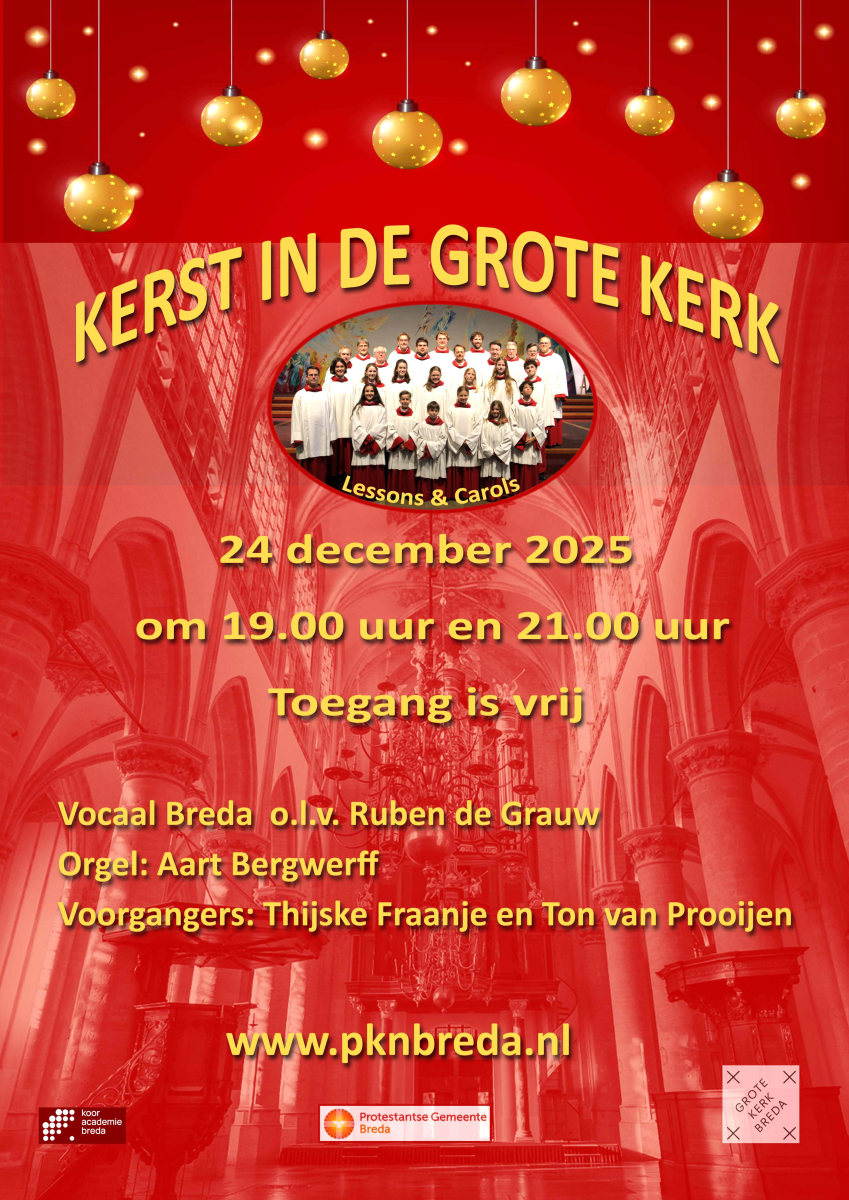 ![]() Kerst in de Grote Kerk Op kerstavond vieren we in Breda samen Kerst in de Grote Kerk! We lezen het kerstverhaal en horen kerstmuziek: een Festival of Nine Lessons and Carols. Vocaal Breda (kooracademie Breda) zingt prachtige Carols en voorgangers Thijske Fraanje en Ton van Prooijen (van de Protestantse gemeente Breda) lezen het kerstverhaal. We gaan ook een aantal bekende kerstliederen samen zingen. Aart Bergwerff speelt orgel en we horen Marjan van der Wel op trompet. Zo willen we het licht van Kerst vieren. We houden dezelfde viering twee keer. Eén keer om 19 uur en één keer om 21 uur. We beginnen om 18.40 en om 20.40 uur al met samen zingen. De toegang is vrij (plaatsen reserveren is niet nodig/mogelijk). Bij de uitgang wordt er gecollecteerd voor de Bredase voedselbank. Vocaal Breda (de Kooracademie) is in 2020 ontstaan vanuit de bijna 100-jarige jongenskoortraditie van het Sacramentskoor. De Lessons & Carols op kerstavond zijn een vast en geliefd onderdeel van deze lange traditie. Protestantse Gemeente Breda is een levendige kerkgemeenschap die hoort bij de Protestantse Kerk Nederland (PKN). We willen een plek van ontmoeting zijn waar iedereen welkom is. Meer informatie op www.pknbreda.nl | ||